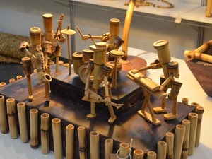e usa o bambu para fazer objetos de decoração, como fontes,